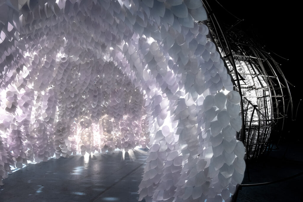 Breathing Room is an immersive installation designed to change the way we experience space around us on a primal level. It is a kinetic light installation in the form of a tunnel, lined with cones that ‘breathe’. The experience is strange and otherworldly – some find it alters consciousness, others have even been moved to tears. (See our 360° film. Playlist of Breathing Room films)