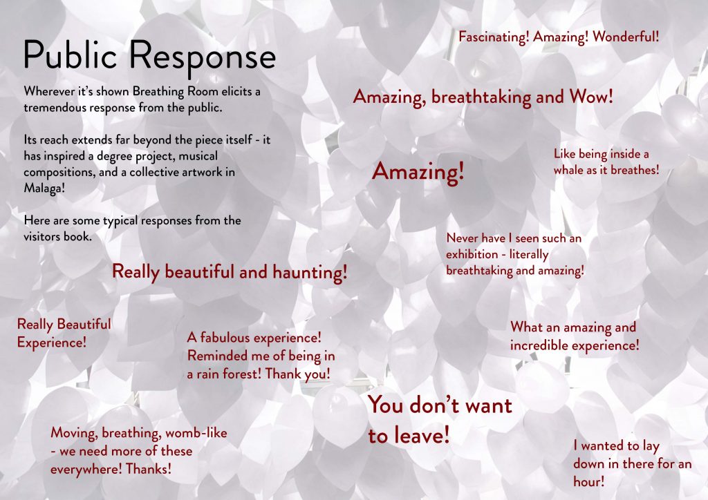 The piece begin in a very different form – the original Breathing Room was quite a political piece, inkeeping with my work at the time. However, after getting an Unlimited R&D grant, it evolved in a different direction. Whilst it remains a kinetic ‘paper’ installation like the original, this version very much focusses on the sensory aesthetic.